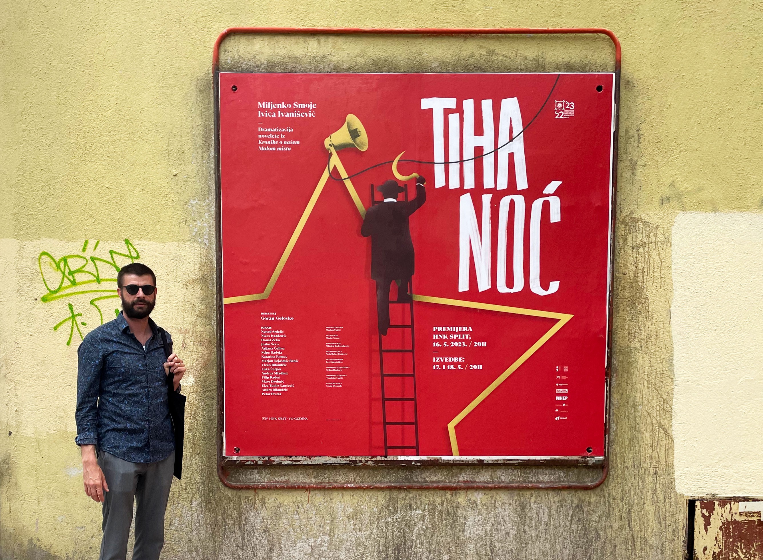 Plakat za predstavu Tiha noć koja se izvodila u Hrvatskom narodnom kazalištu u Splitu. Po hitnoj narudžbi morali smo izraditi vizual za predstavu koja je nastala iz jedne epizode Malog mista Miljenka Smoje.Na Badnjak se u Malom mistu odvijala prava drama između tadašnje komunističke vlasti i predstavnika malomišćanske crkve.