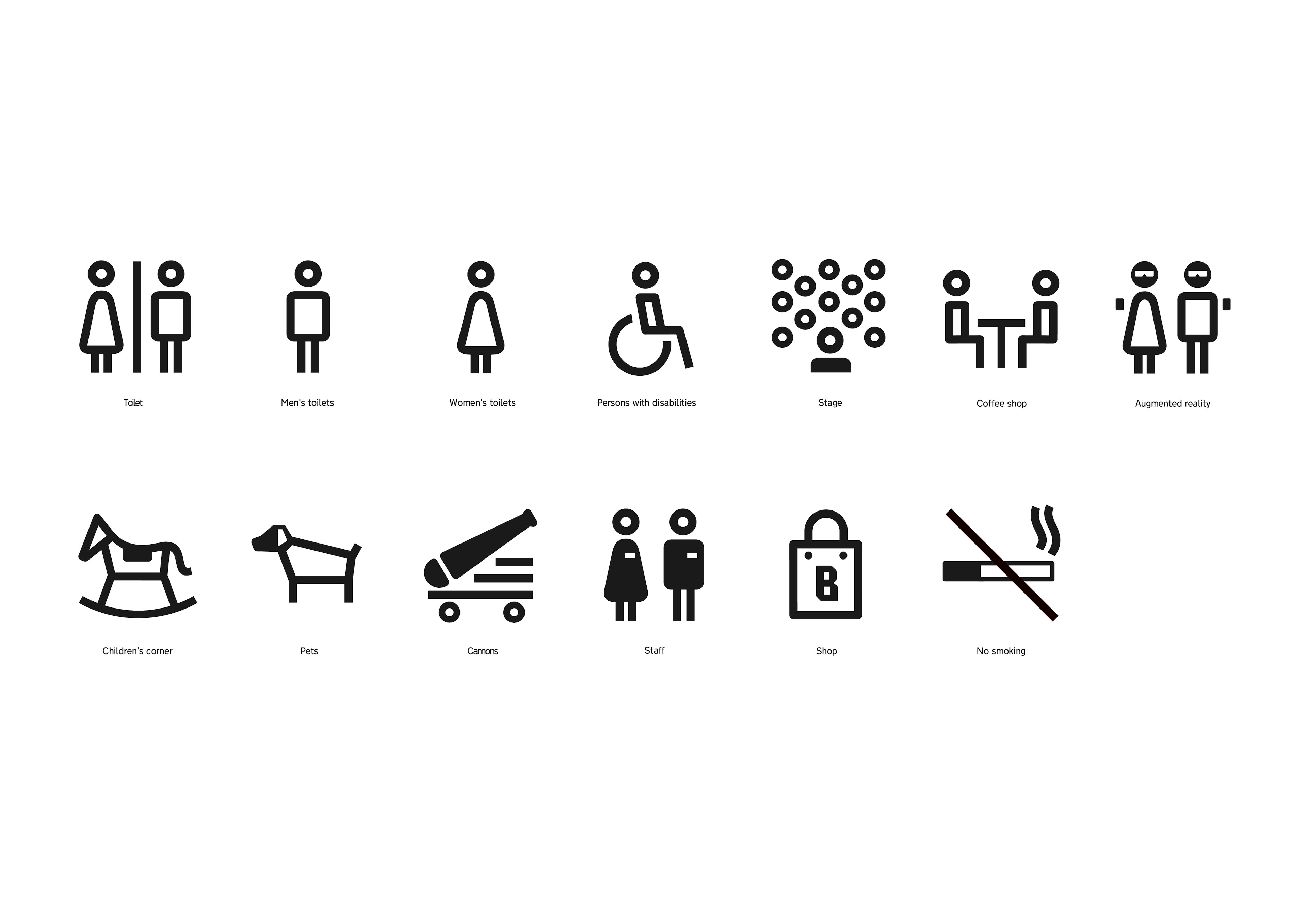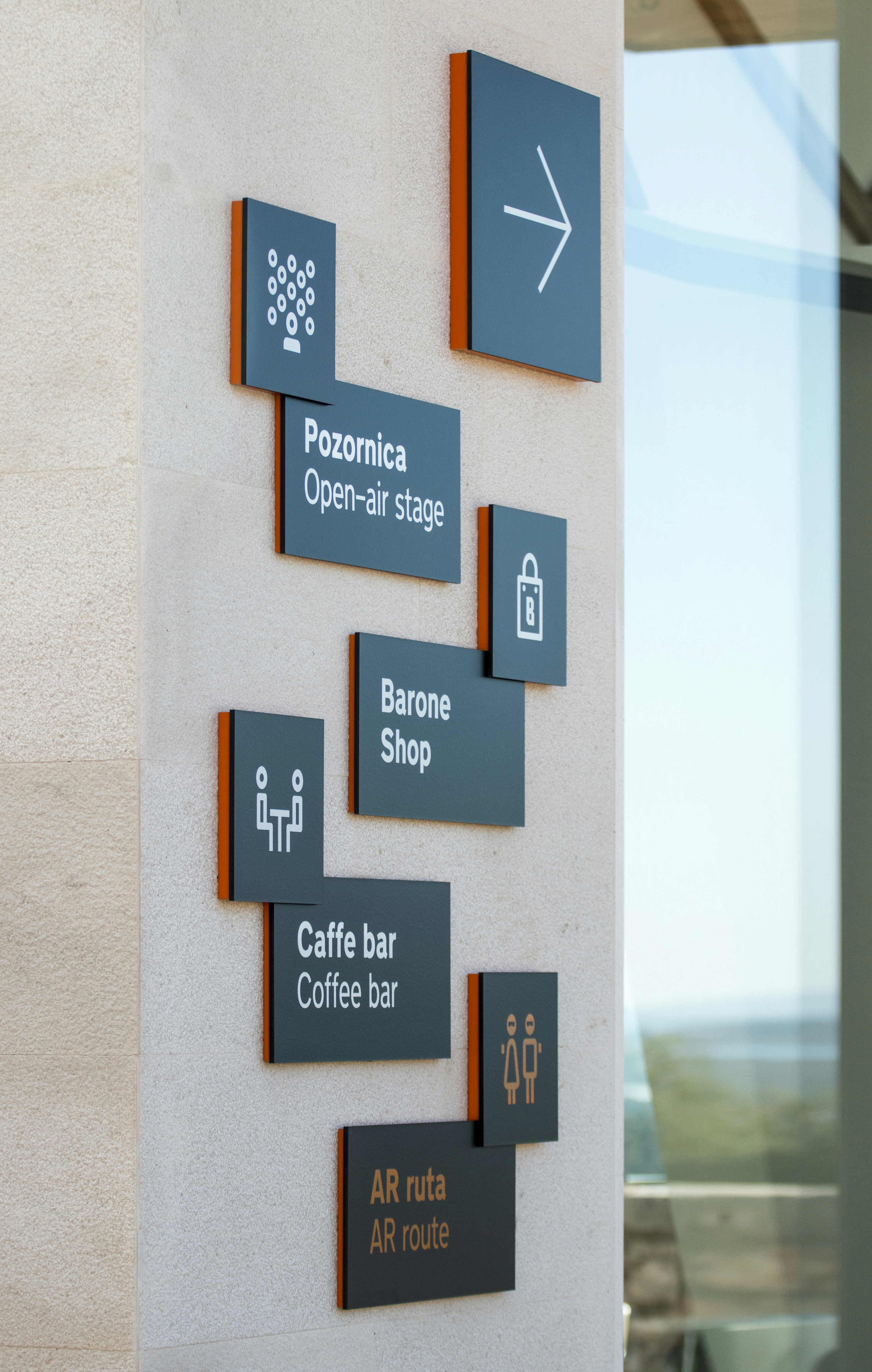 Posjetitelji mogu dobiti sve potrebne informacije ili upute putem tri različite kategorije znakova koji služe za pronalaženje odredišta, orijentaciju ili informiranje. Tijekom procesa dizajna svakom je znaku dodijeljen funkcionalni sloj, tako da svaki sloj sadrži određenu vrstu informacije – tekstualni se dio nalazi na najnižem sloju, dok je strelica (smjer kretanja) na najvišem.