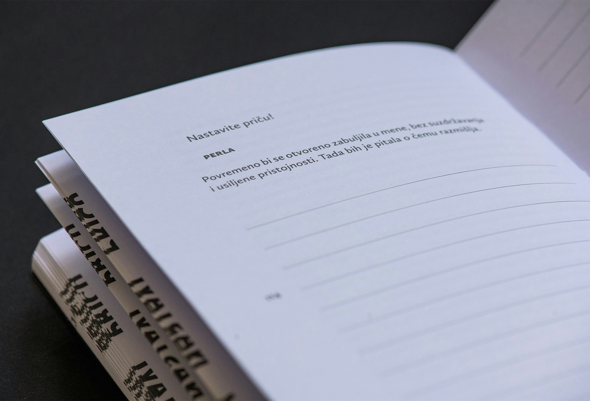Zbirka „Nastavi priču” sadrži 12 priča koje je na temelju fragmenata nastalih na Književnom klubu i radionici kreativnog pisanja u Ženskoj kaznionici u Požegi napisalo 12 spisateljica, i to: Marija Andrijasević, Staša Aras, Lana Bastašić, Ivana Bodrožić, Maša Kolanović, Tanja Mravak, Marija Rakić Mimice, Korana Serdarević, Nora Verde, Jelena Zlatar Gamberožić, Jasna Jasna Žmak i Luiza Bouharaoua.