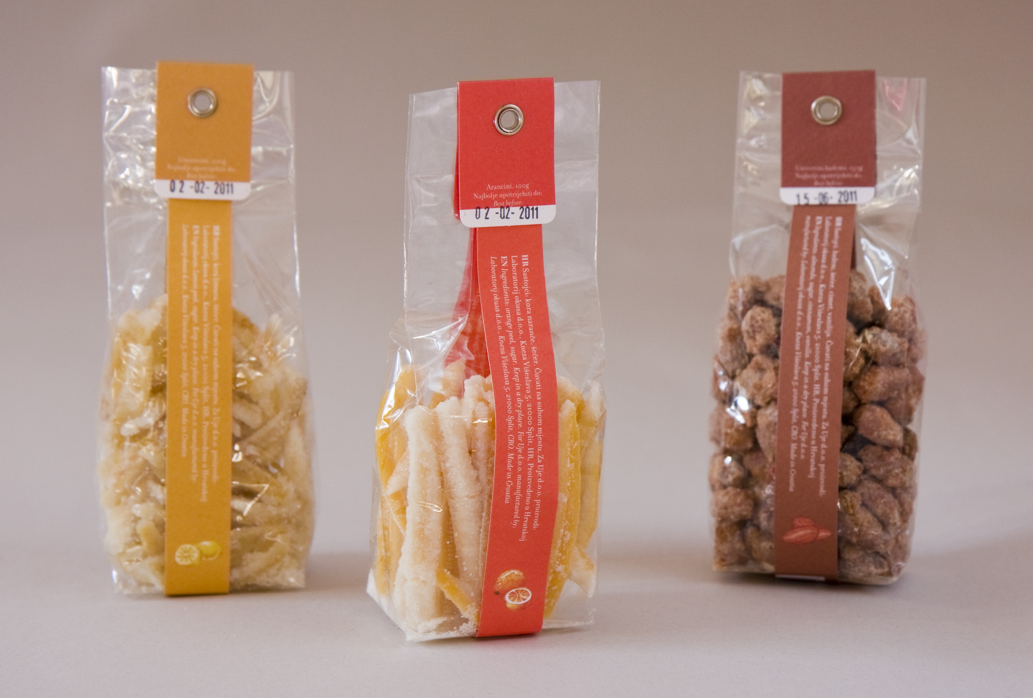 Packaging for candied fruit. Sugar coated almonds, sugar coated orange peel and sugar coated lemone peel.
