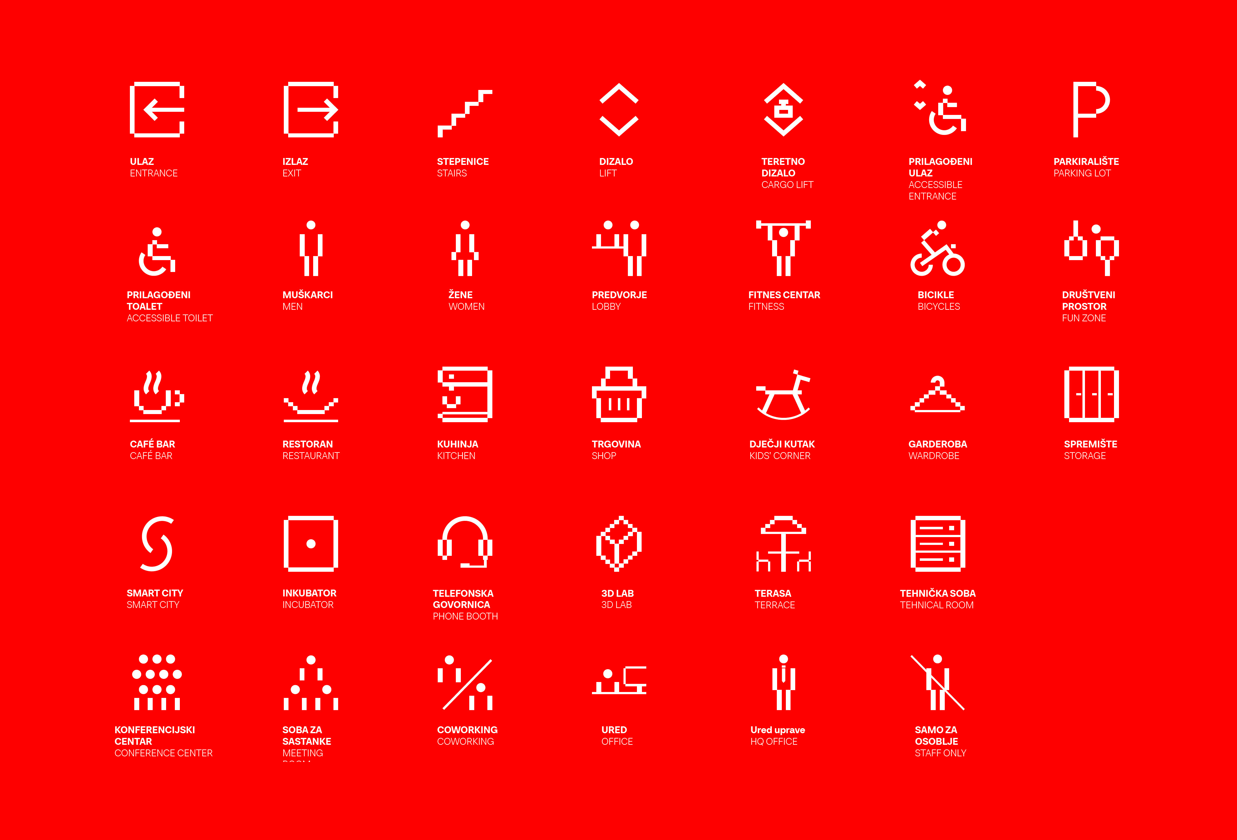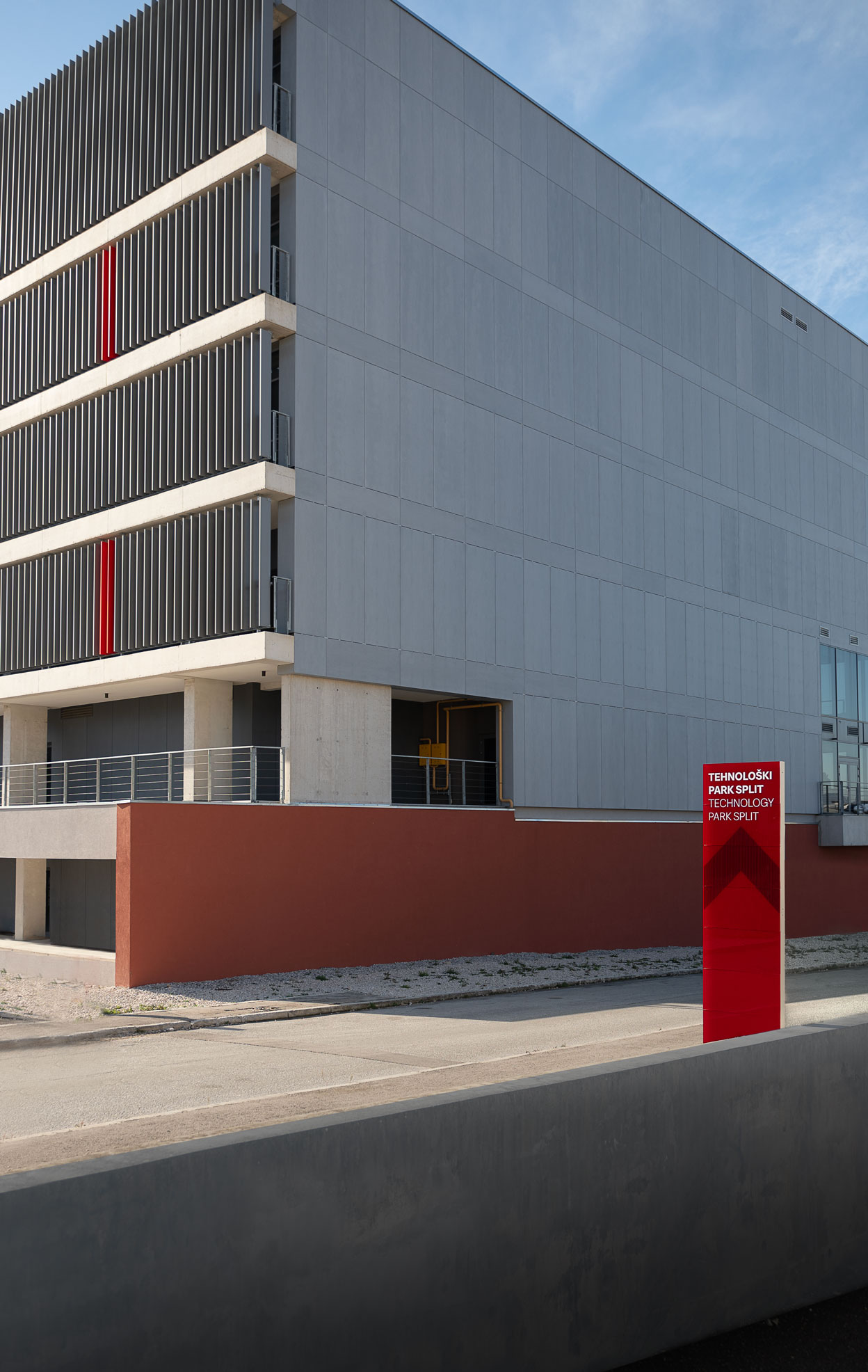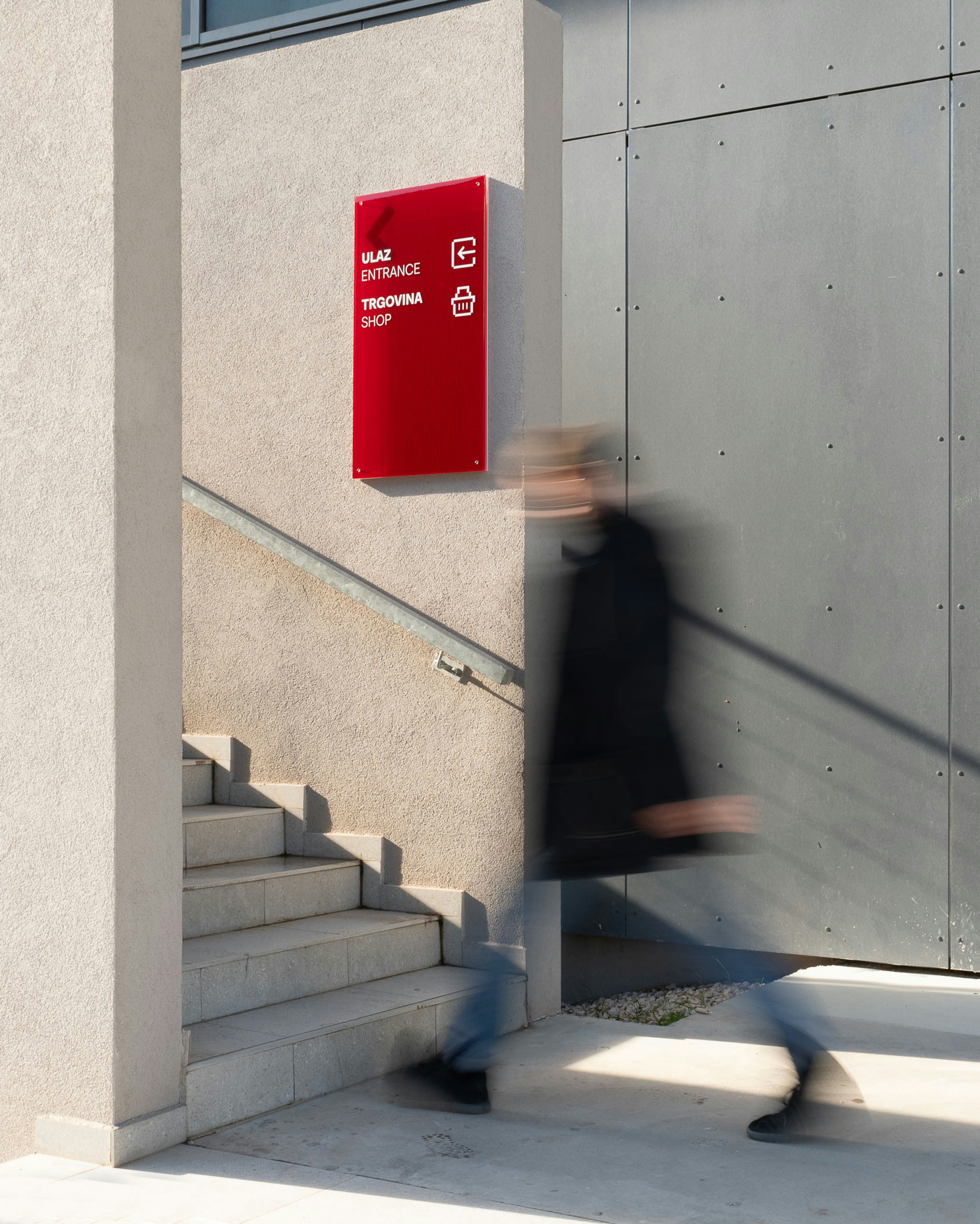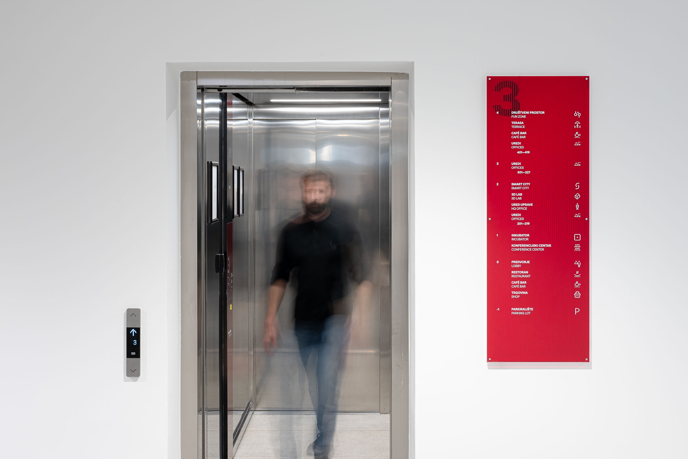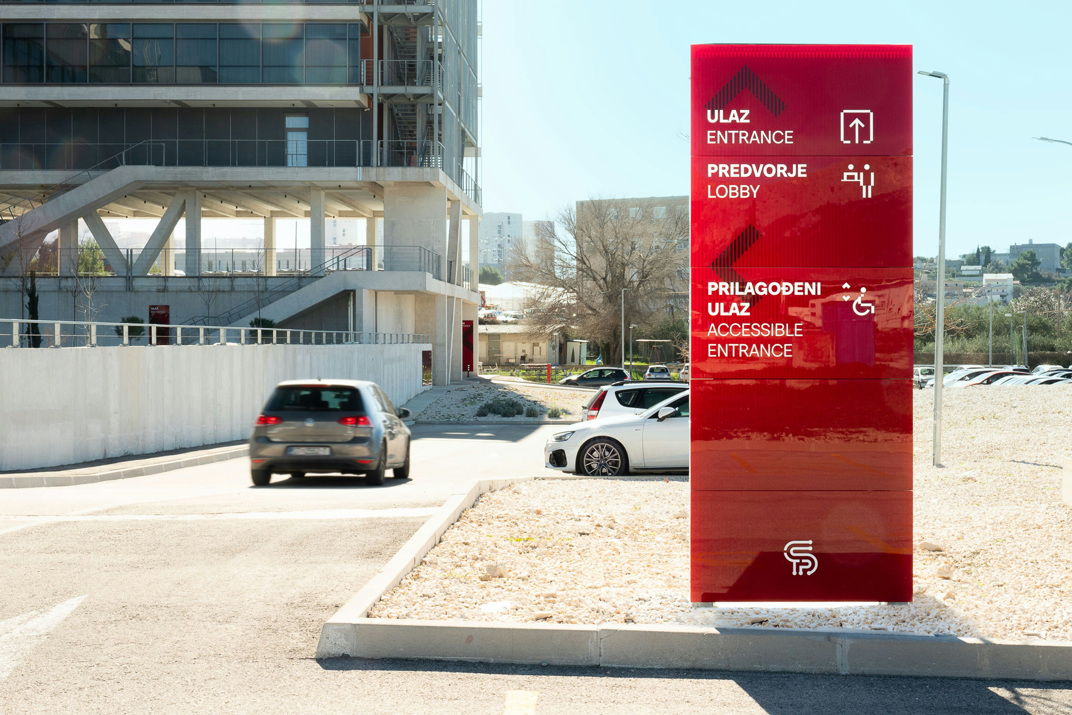 The Technology Park Split is located in a renovated building originally designed as part of a military complex and later transformed into a hub for advanced technologies. Due to the architectural configuration of the building, several functions are positioned on mezzanine levels, making orientation within the 4,252 m² facility demanding. The presence of multiple entrances and intersecting circulation routes further complicates navigation, making detailed spatial analysis a key step in the signage design process.