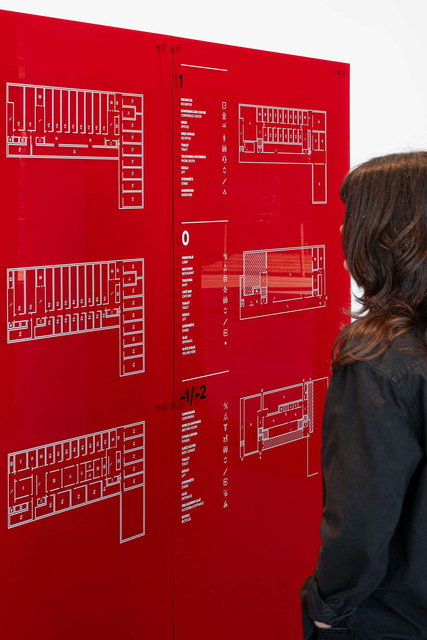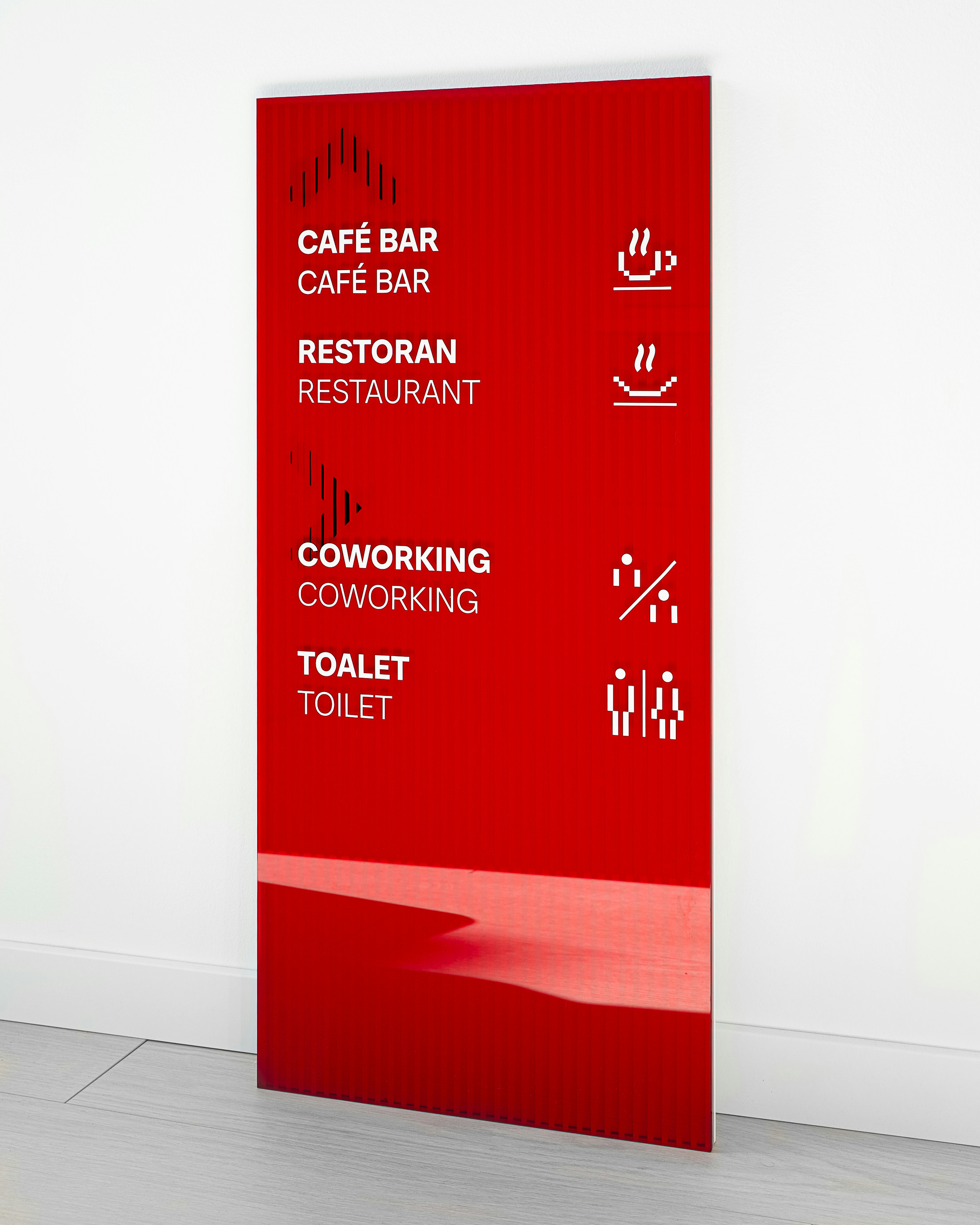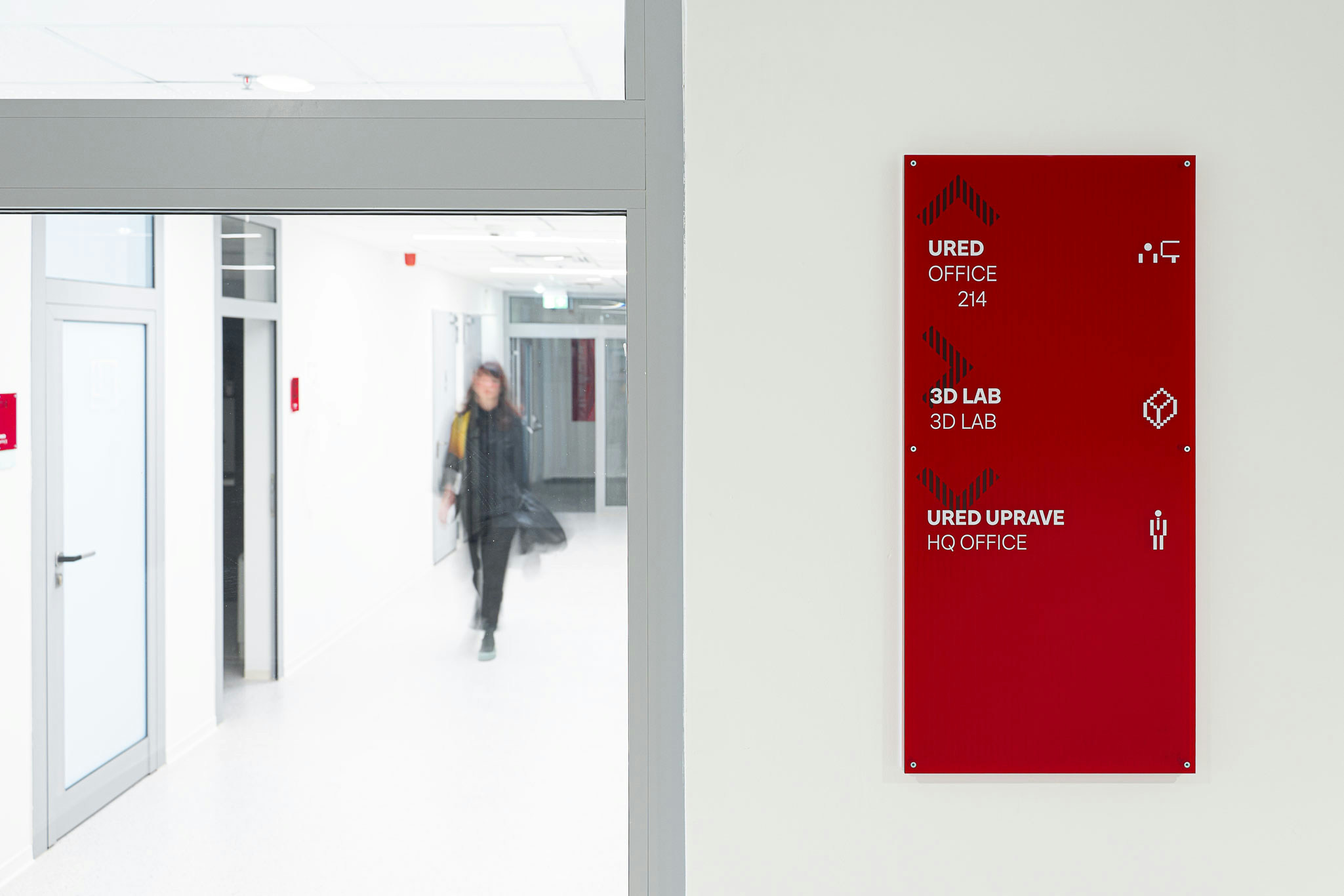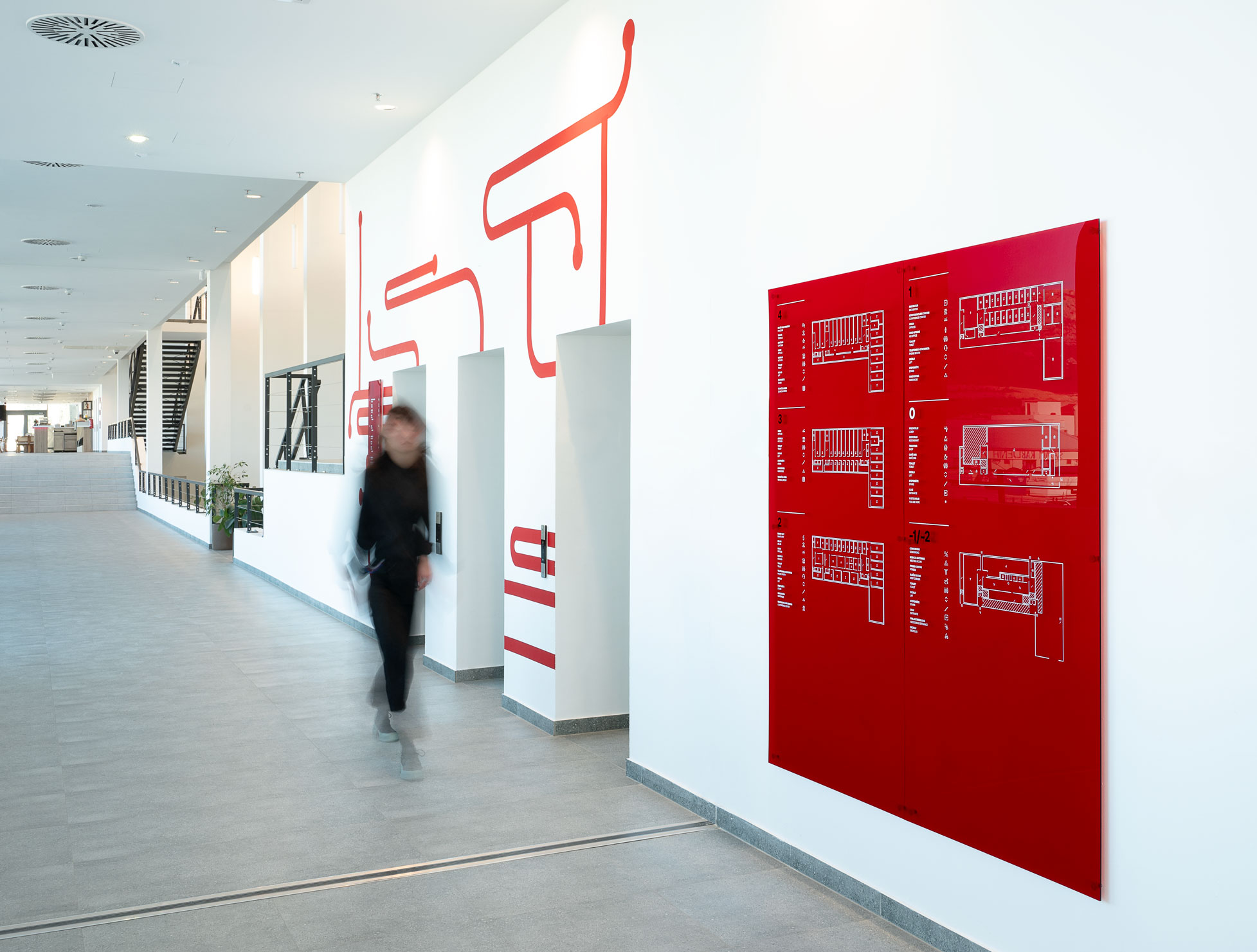 The project introduces a visually distinctive signage system based on raster lines and layered structures. Each orientation sign consists of three panels, two of which contain printed line rasters. By carefully spacing the layers, a subtle analog animation effect is created: as users move past the signage, the shift in perspective makes the graphic elements appear animated. The use of translucent red plexiglass also introduces a strong color accent to the predominantly white interior.