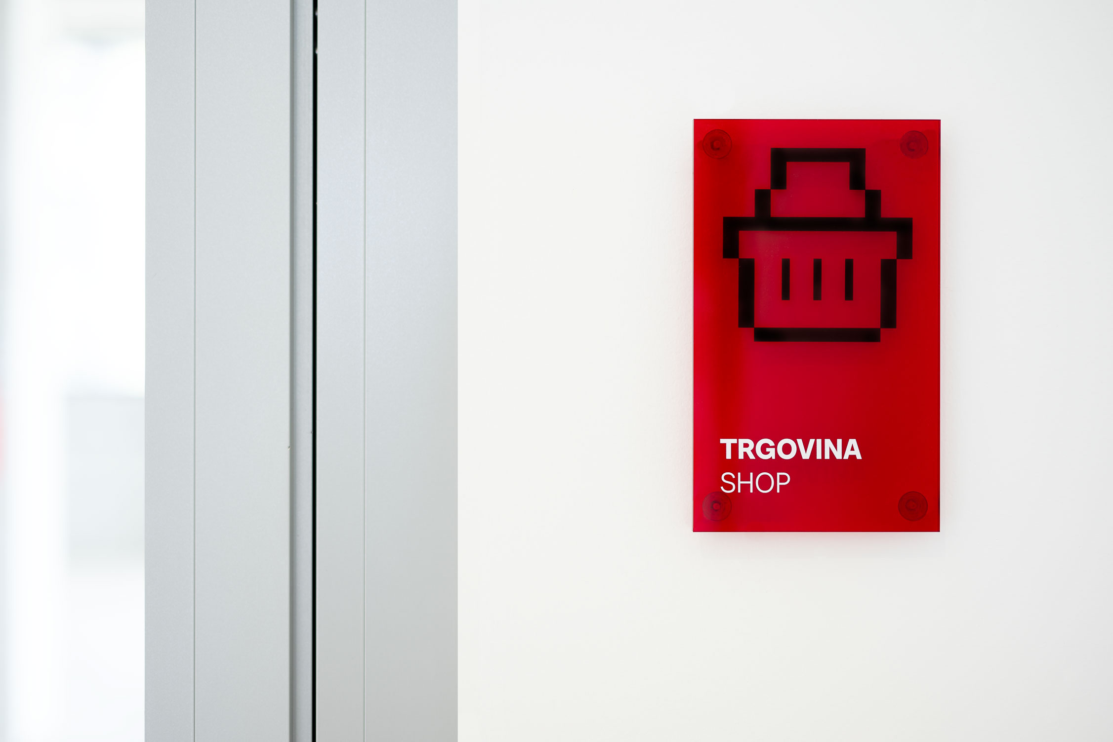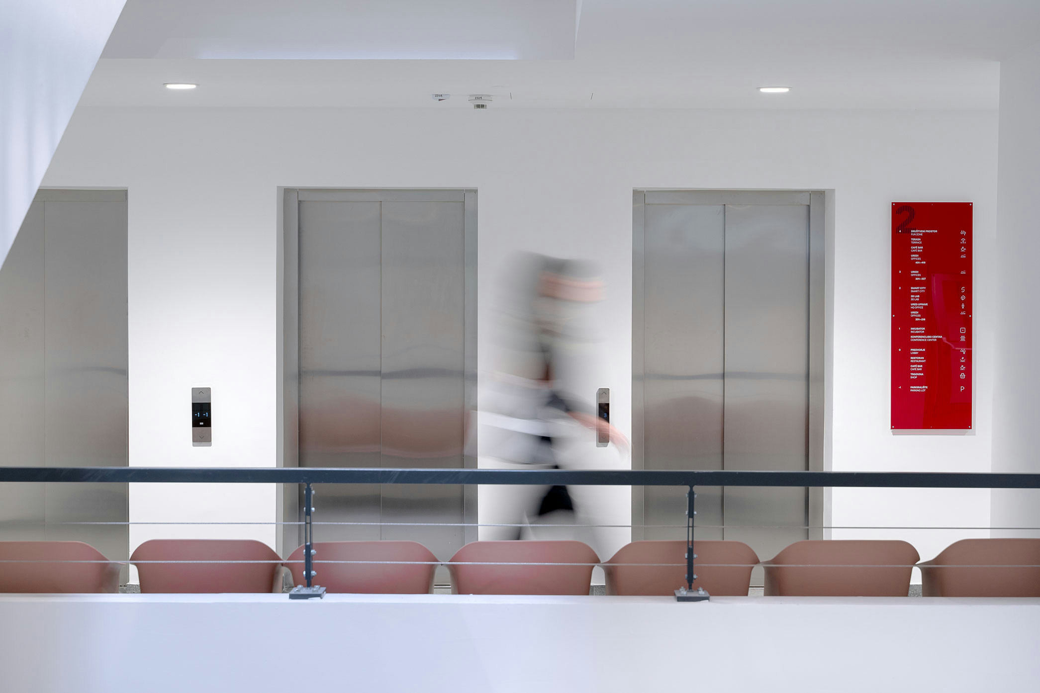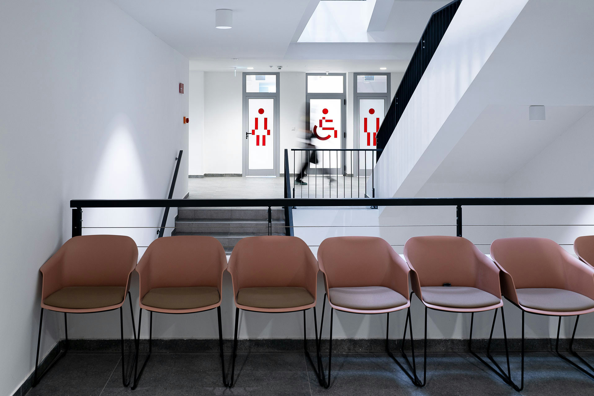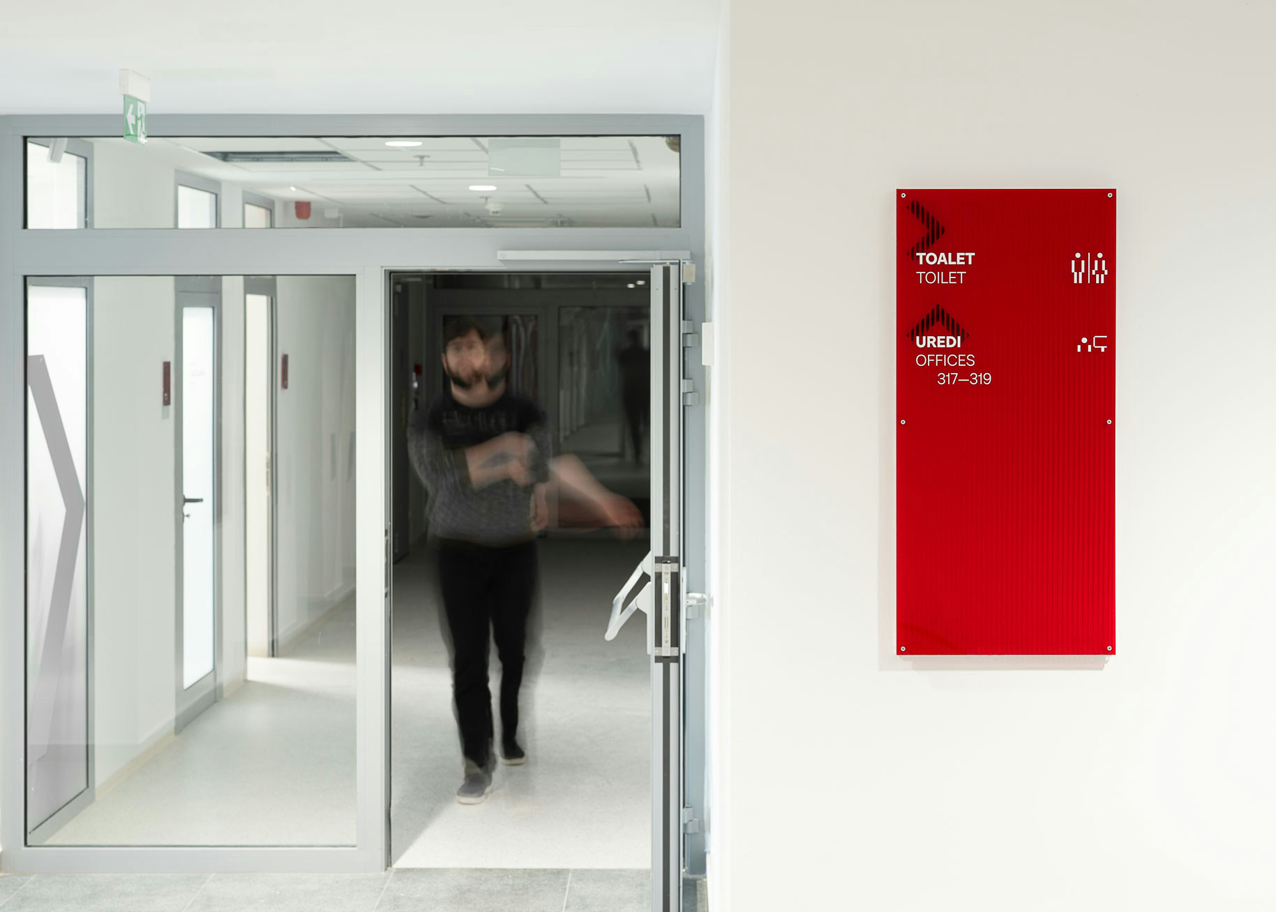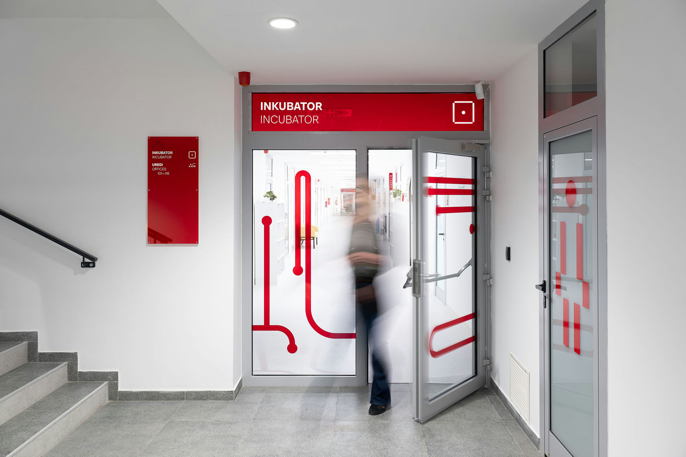 The project introduces a visually distinctive signage system based on raster lines and layered structures. Each orientation sign consists of three panels, two of which contain printed line rasters. By carefully spacing the layers, a subtle analog animation effect is created: as users move past the signage, the shift in perspective makes the graphic elements appear animated. The use of translucent red plexiglass also introduces a strong color accent to the predominantly white interior.