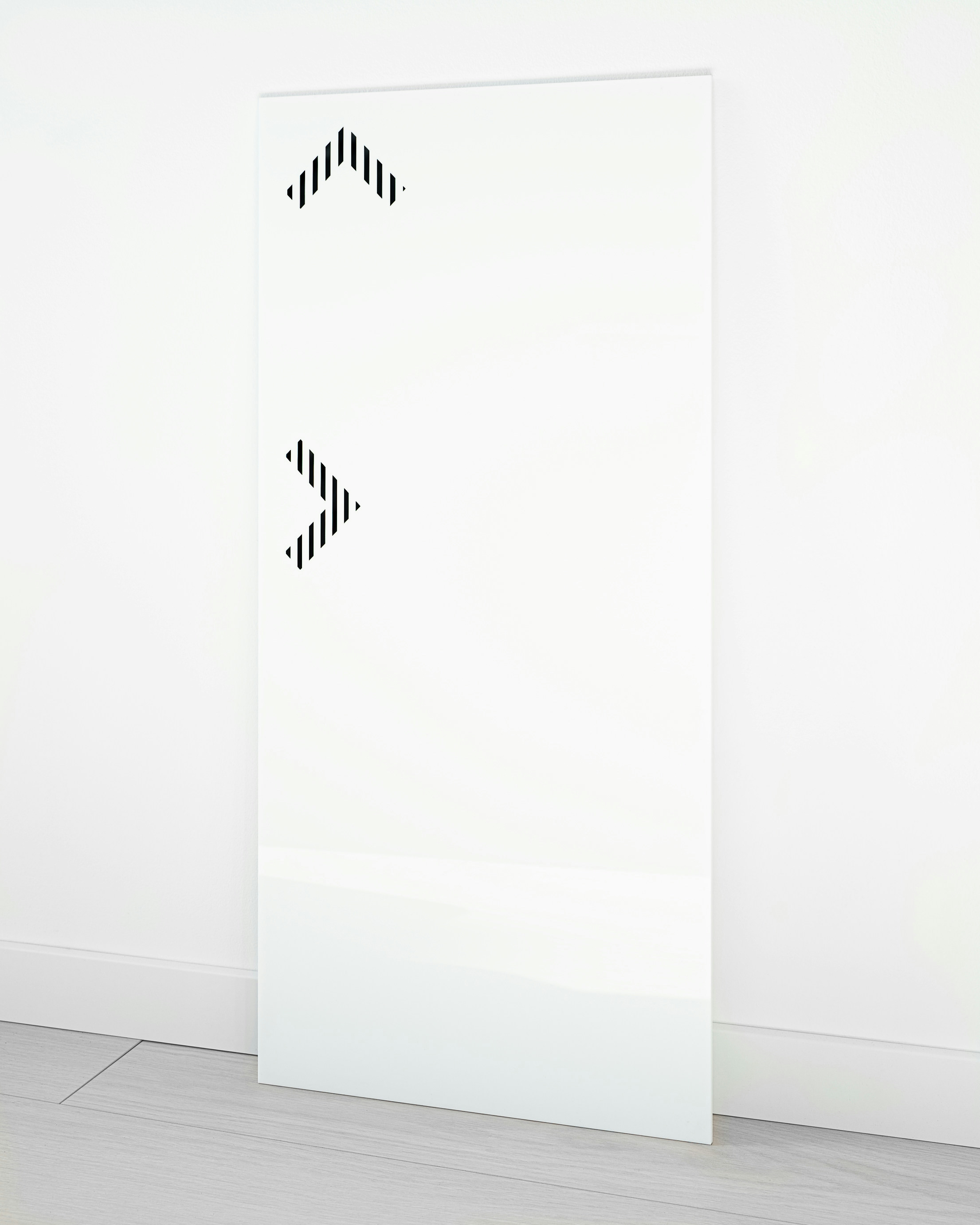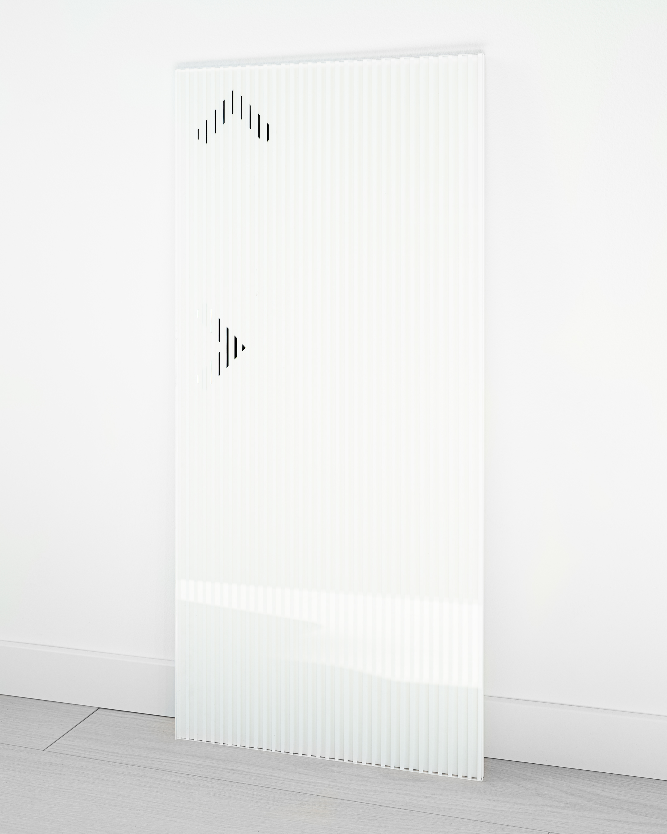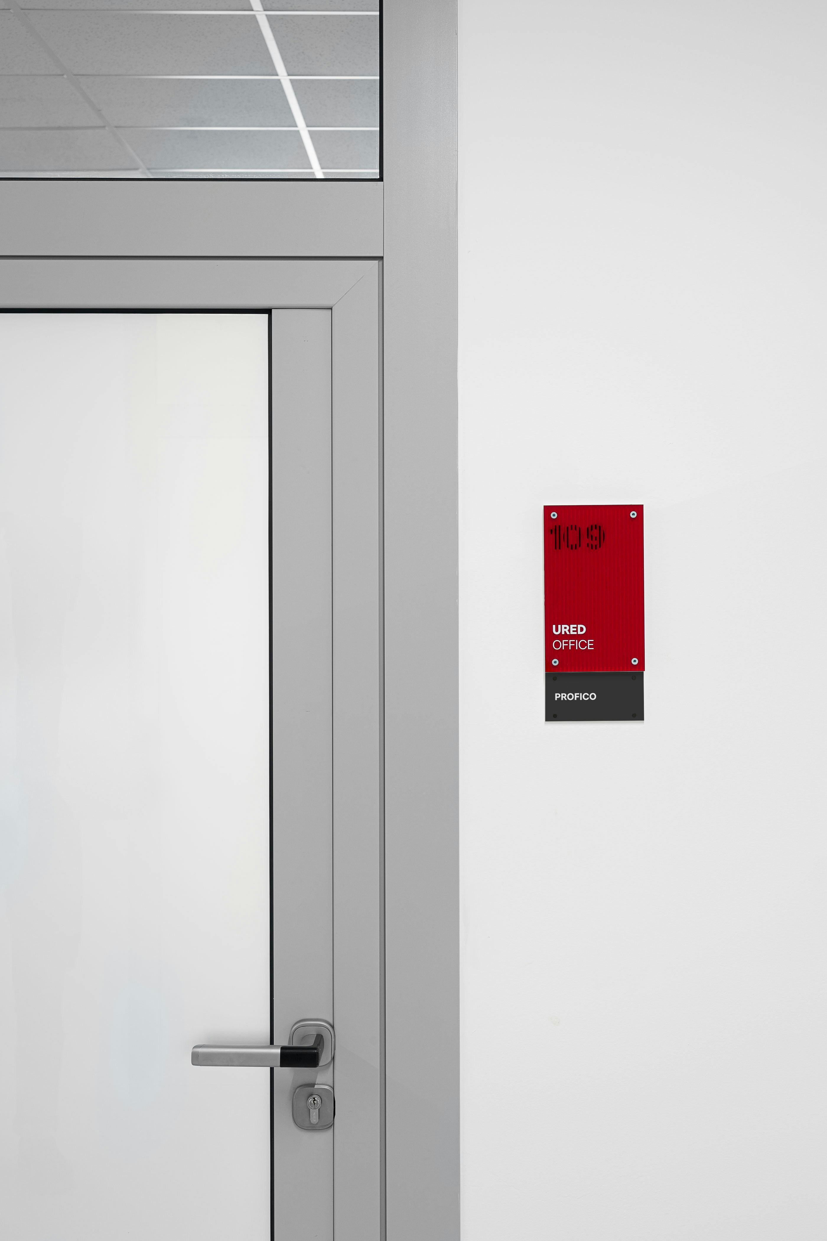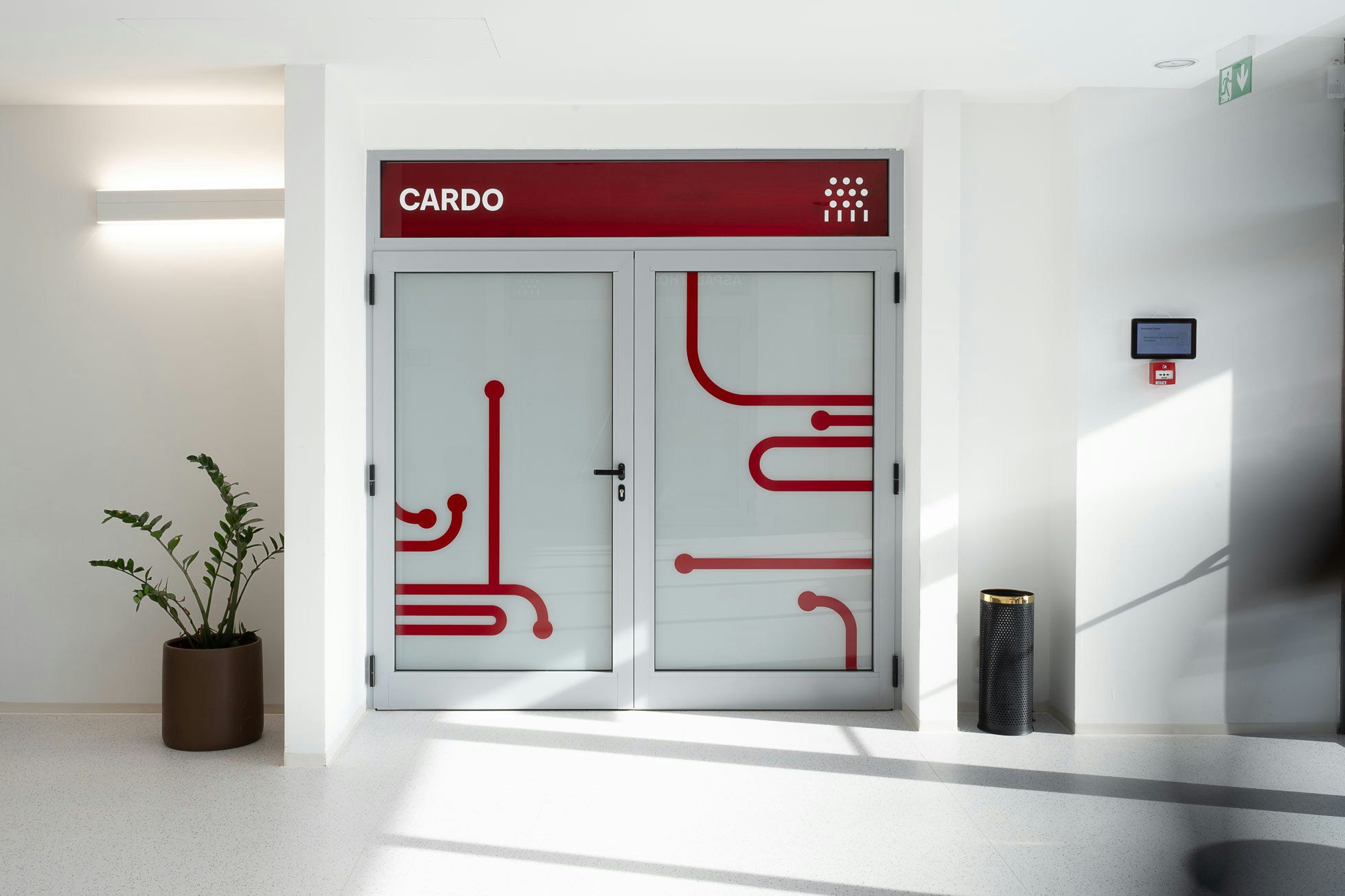 The project introduces a visually distinctive signage system based on raster lines and layered structures. Each orientation sign consists of three panels, two of which contain printed line rasters. By carefully spacing the layers, a subtle analog animation effect is created: as users move past the signage, the shift in perspective makes the graphic elements appear animated. The use of translucent red plexiglass also introduces a strong color accent to the predominantly white interior.